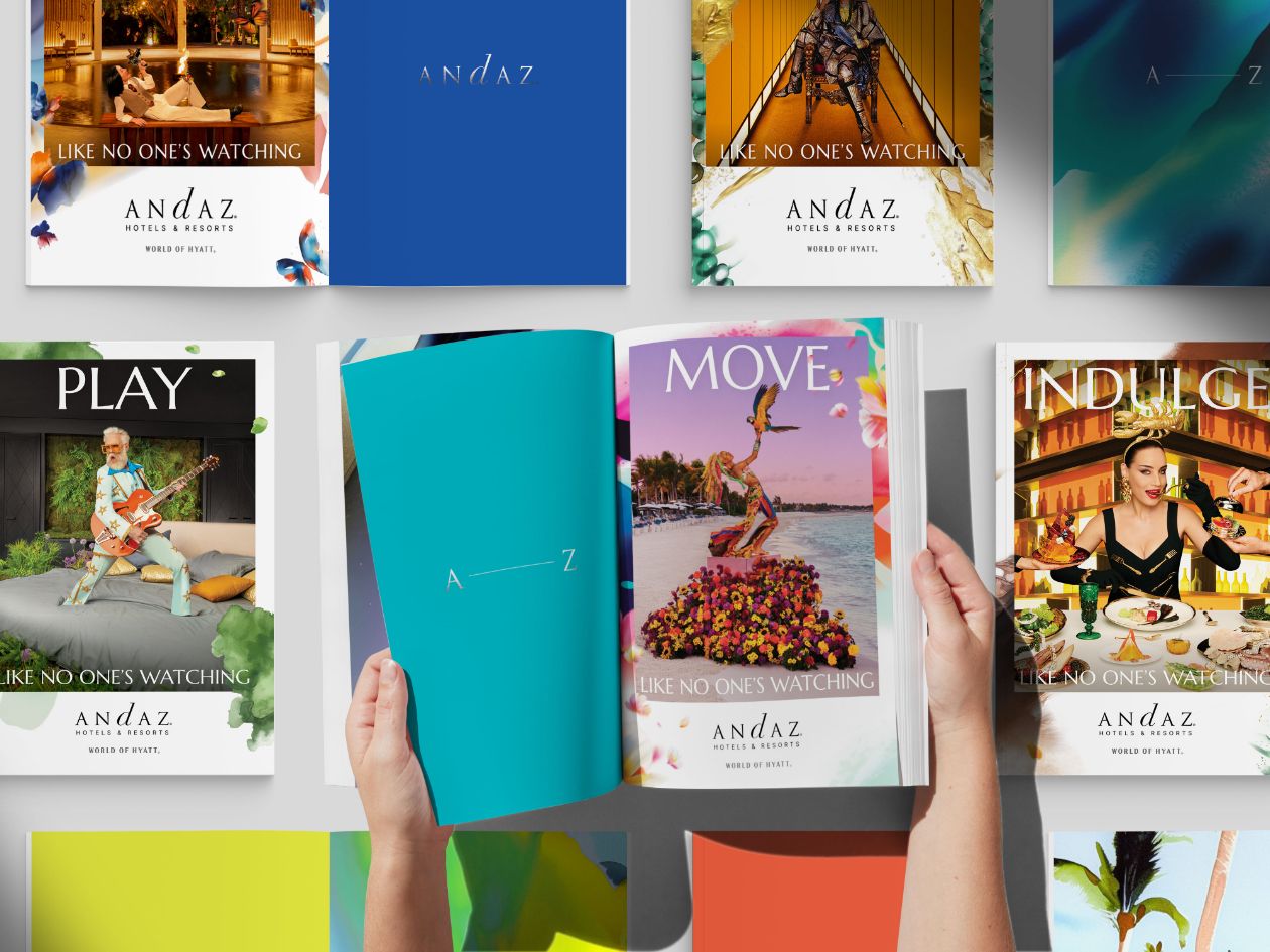 Andaz’s new identity is reflected visually on the considerable amount of collateral a hotel requires. As an extension of “sophisticated whimsy,” its bold color palette, typographic system, and photography style ensure that Andaz maintains its status as a brand that’s both elevated and playful.