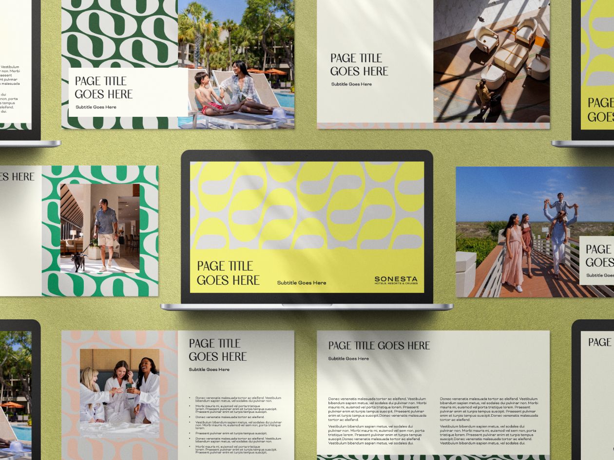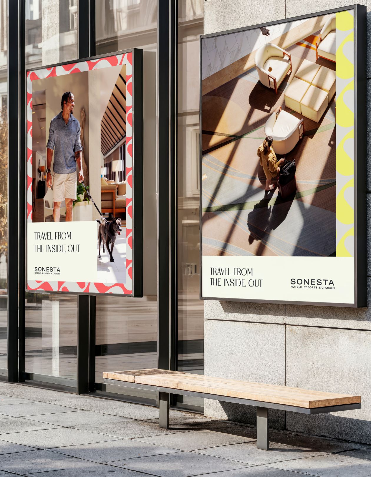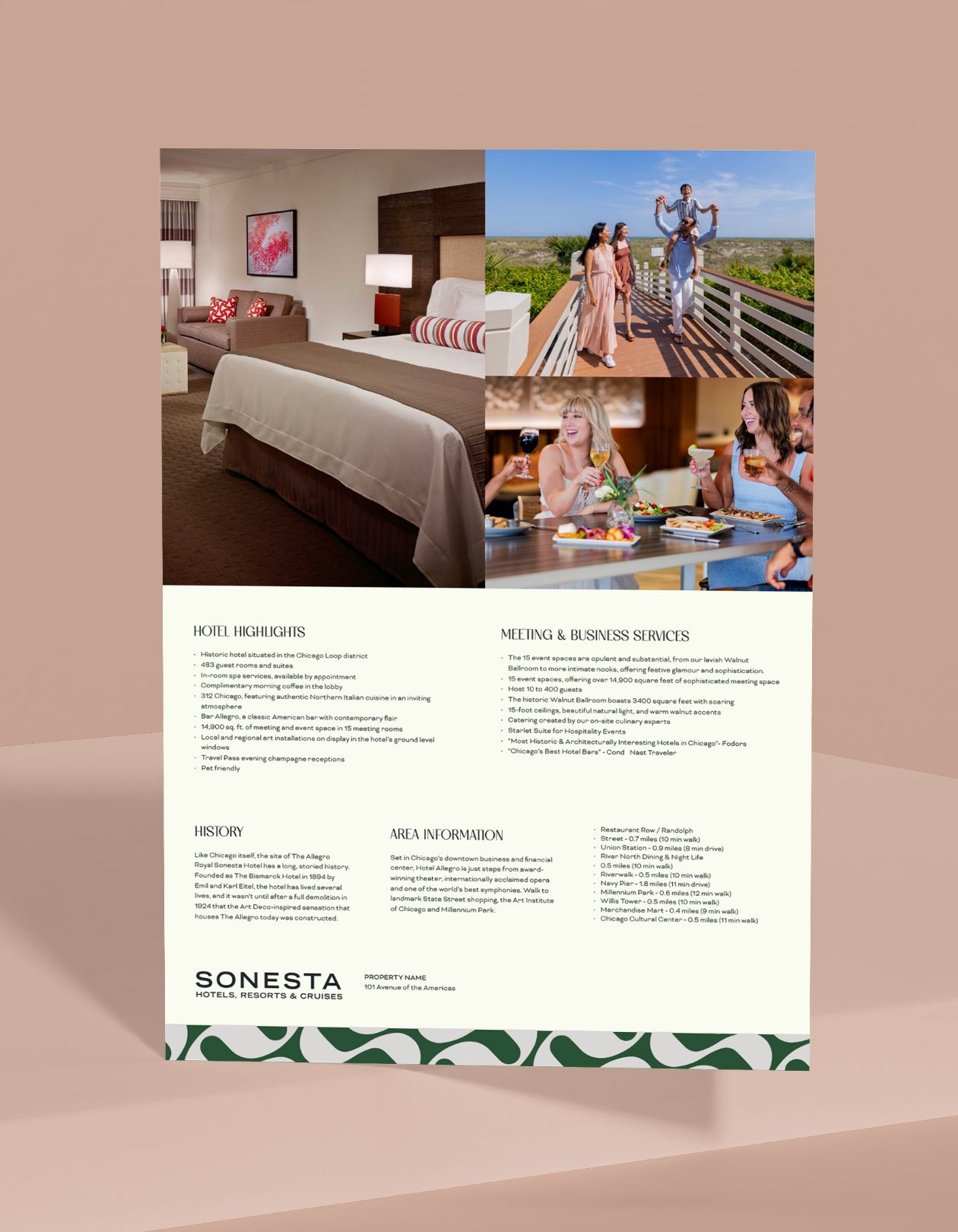 We established a color palette, typographic system, and photography style to illustrate the brand’s upscale, lifestyle positioning while appealing to younger and young-at-heart travelers. We paid homage to the Sonesta “S” by creating a unique pattern that could be applied to the brand’s collateral, reinforcing its identity in a subtle way.